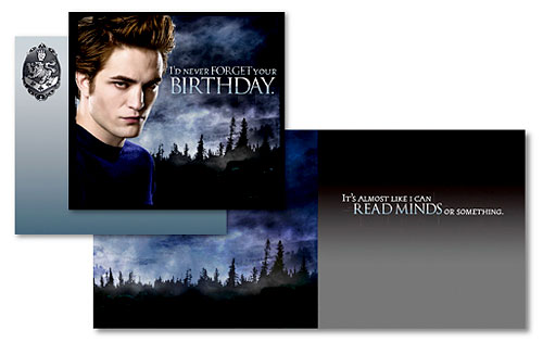 Robert Pattinson kíván Boldog Szülinapot, azokon a kártyákon, amit a Hallmark már elkezdett leleplezni. Főleg Rob, Kris és Taylor van rajtuk és nekem nagyon tetszenek, mivel találó és vicces kis szövegek vannak a hátoldalon. De ez nem minden! Egyes kártyákon levehető könyvjelző van, vagy egy oldalnyi matrica, de ezt skubizzátok: beépített zenelejátszó, ami a Twilight filmzenéjéből játszik részleteket. Úristen! Már azt várom, amikor Robos WC papírt lehet majd venni, ami énekli a Let Me Sign-t, ha letekered. Haha… Amúgy nem csak szülinapos, de halloween-i és valentin napi variációk vannak.Nemelég?
